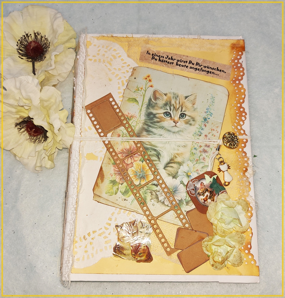 Zartes, handgemachtes Junk Journal im Format DIN A5 mit herausnehmbarer Signatur, Einsteckfächern für Fotos & Notizen und losem Notizzettel. Viele dekorative Seiten + großzügig Platz zum Schreiben — perfekt als Geschenk oder zum Ausprobieren.