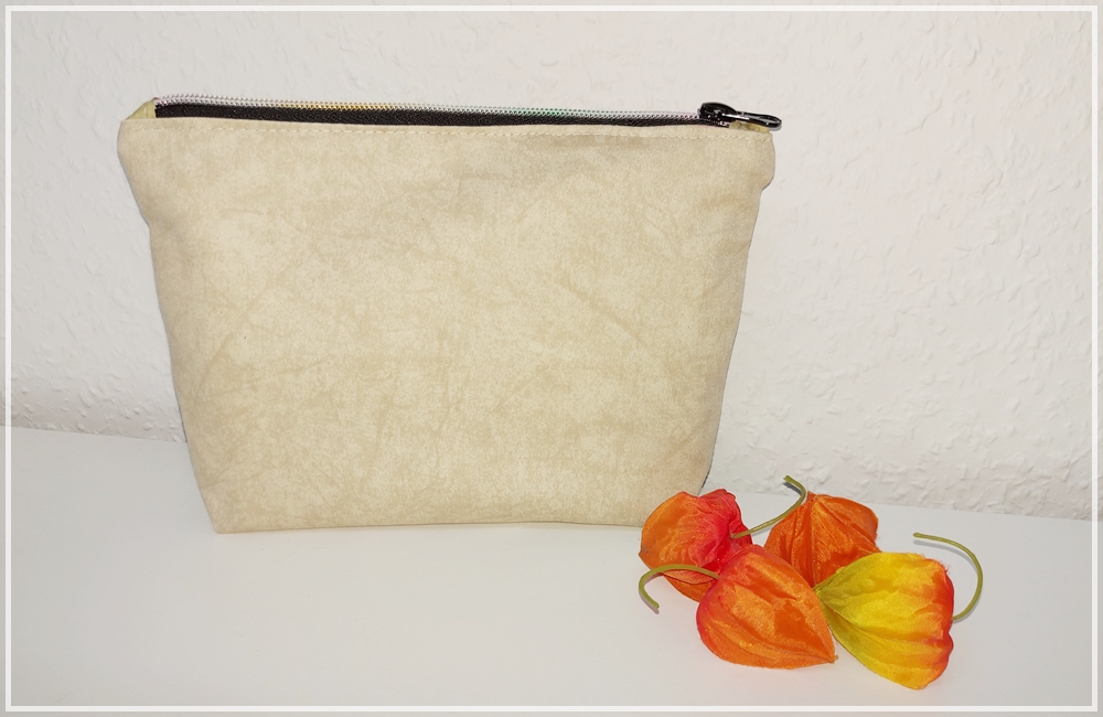 Ein schwarzer Hengst ergänzt mit hellem, festen Baumwollstoff, verschlossen wird diese Kosmetiktasche mit einem Reißverschluss in Regenbogenfarben / Schwarz.