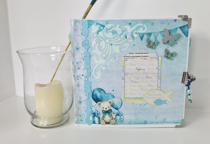 Angefertigt in Handarbeit, mit hübschen Babypapier in vielen Blau, Grüntönen, ergänzt mit weißem Unipapier.