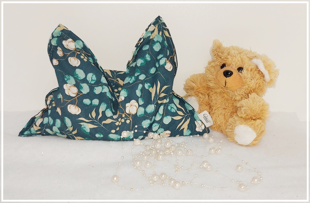 ca. 700 g Weizenkörnern gefüllt, daher ist es gut beweglich und legt sich auch auf der Schulter oder ans Knie gut an.