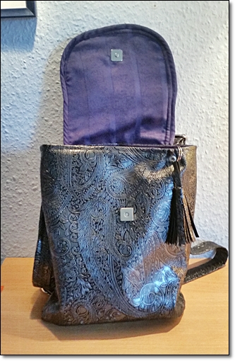 Das dunkelblaue Innenfutter gibt einen schönen Kontrast und eine Quaste verziert ihn zusätzlich.